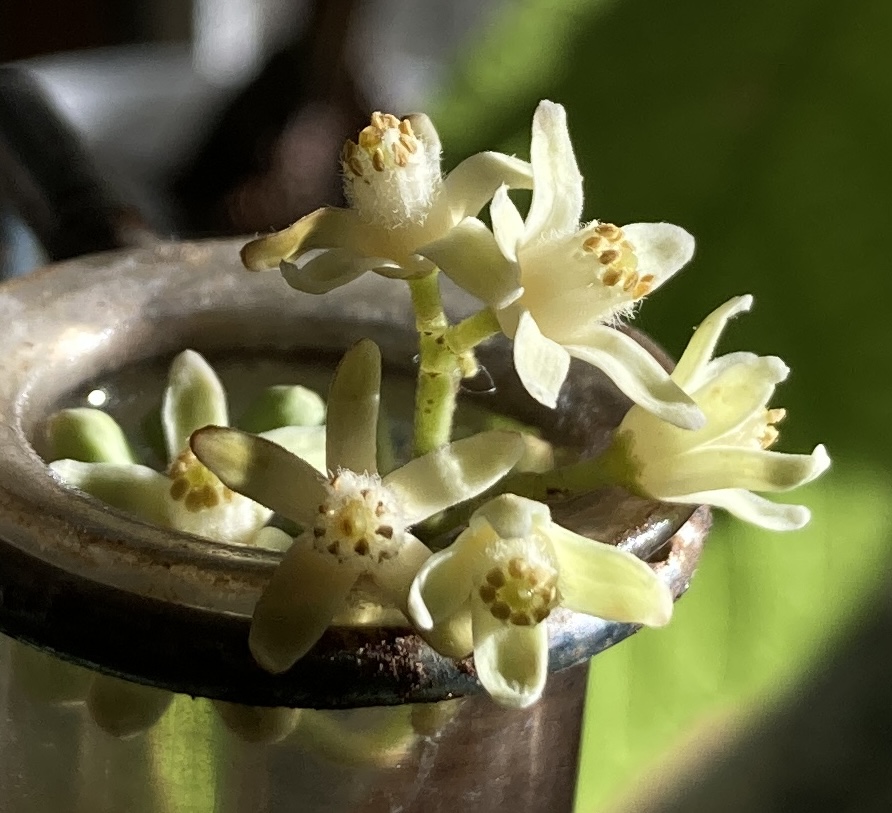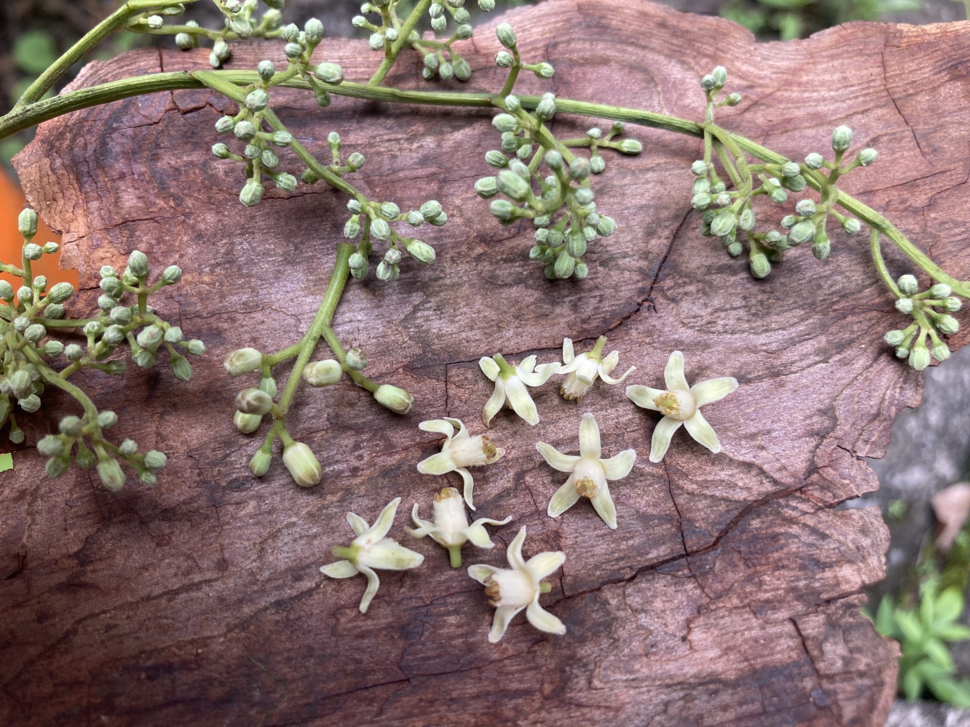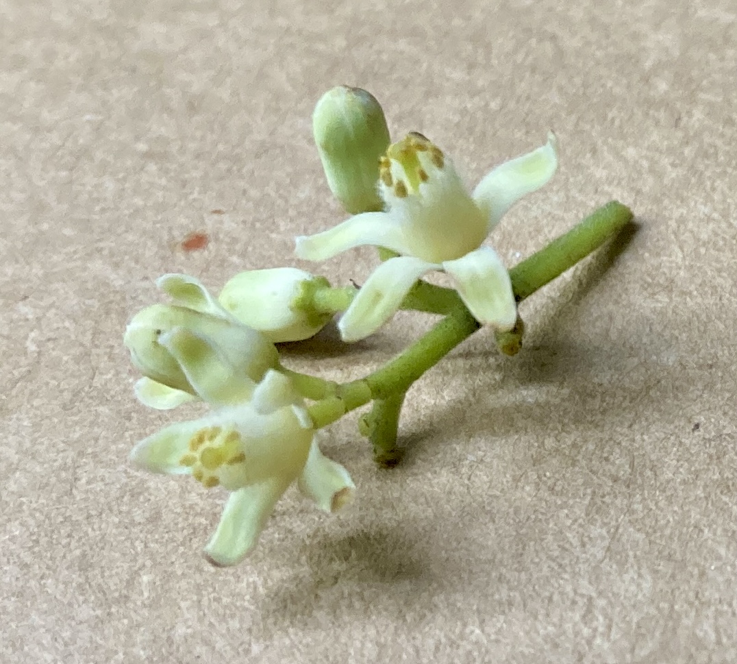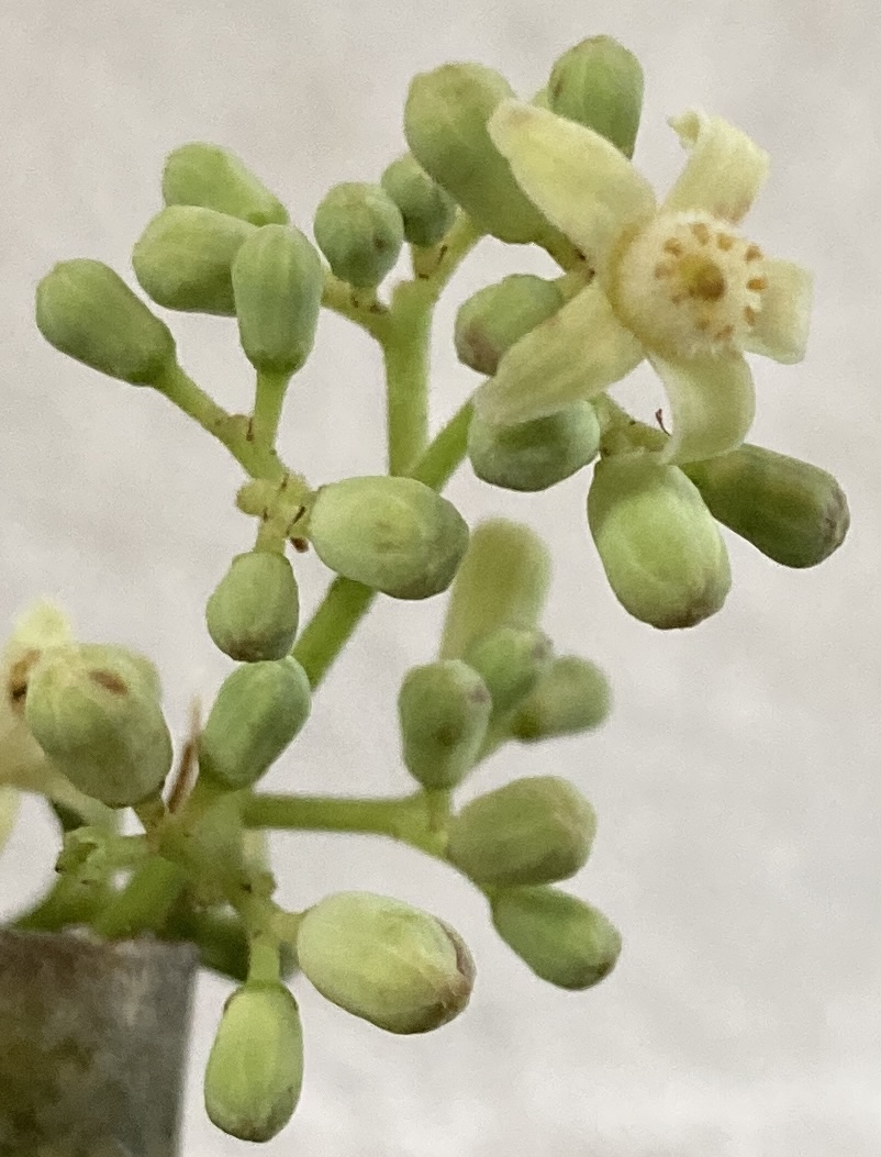 Flowers (1cm) appear in axillar panicles during June and July and are crème or pale green in color. A minute, star-shaped green calyx supports five, narrow petals. Inside, the 10 stamens stand erect and just touching, giving the impression of a cylindrical tube with the yellow anthers positioned distally. A green pistil lurks at the center of this structure. Blossoms open at night and are actively being shed by morning.