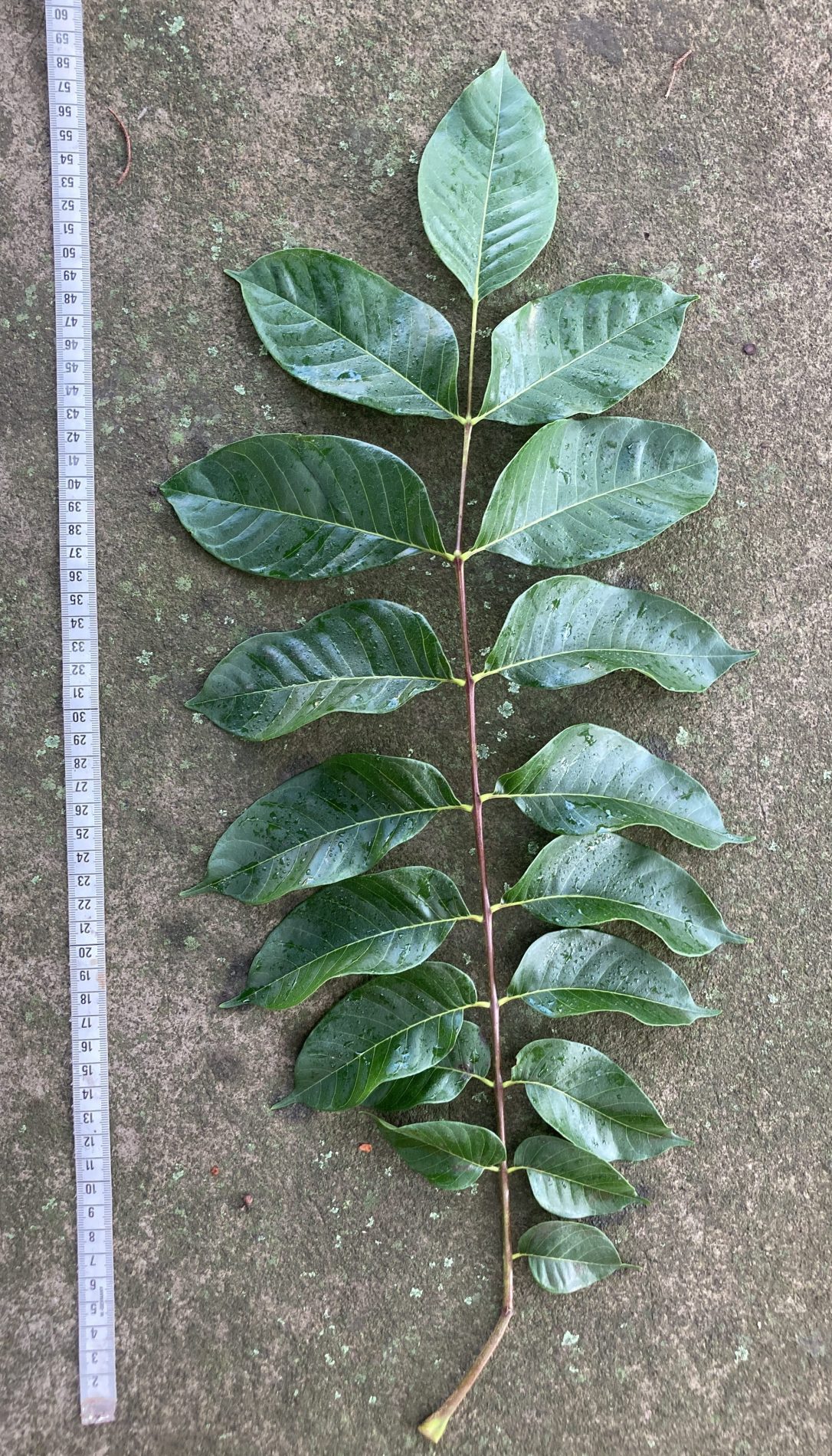 Leaves are quite large (45-55cm x15cm), imparipinnate and alternate. The grow in relatively compact clusters at the ends of the twigs, leaving most of the branches bare. Each leaf consists of 7 or 8 pairs of elliptical leaflets that gradually decrease in size towards the base of the petiole. New foliage is generated at the start of the Pacific coastal rainy season in April and May.