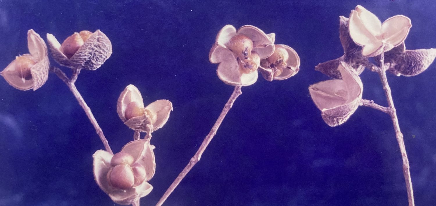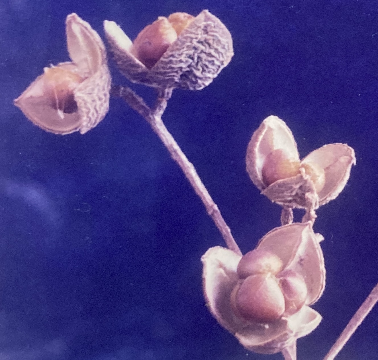 Fruits (1.5-2cm) are 3-lobed, globular, dehiscent capsules. The outer surface matures light tan and contoured with narrow wrinkles. Opening in 3 parts in the late months of the year, an equal number of bronze-colored, rounded seeds (0.8cm) are released.