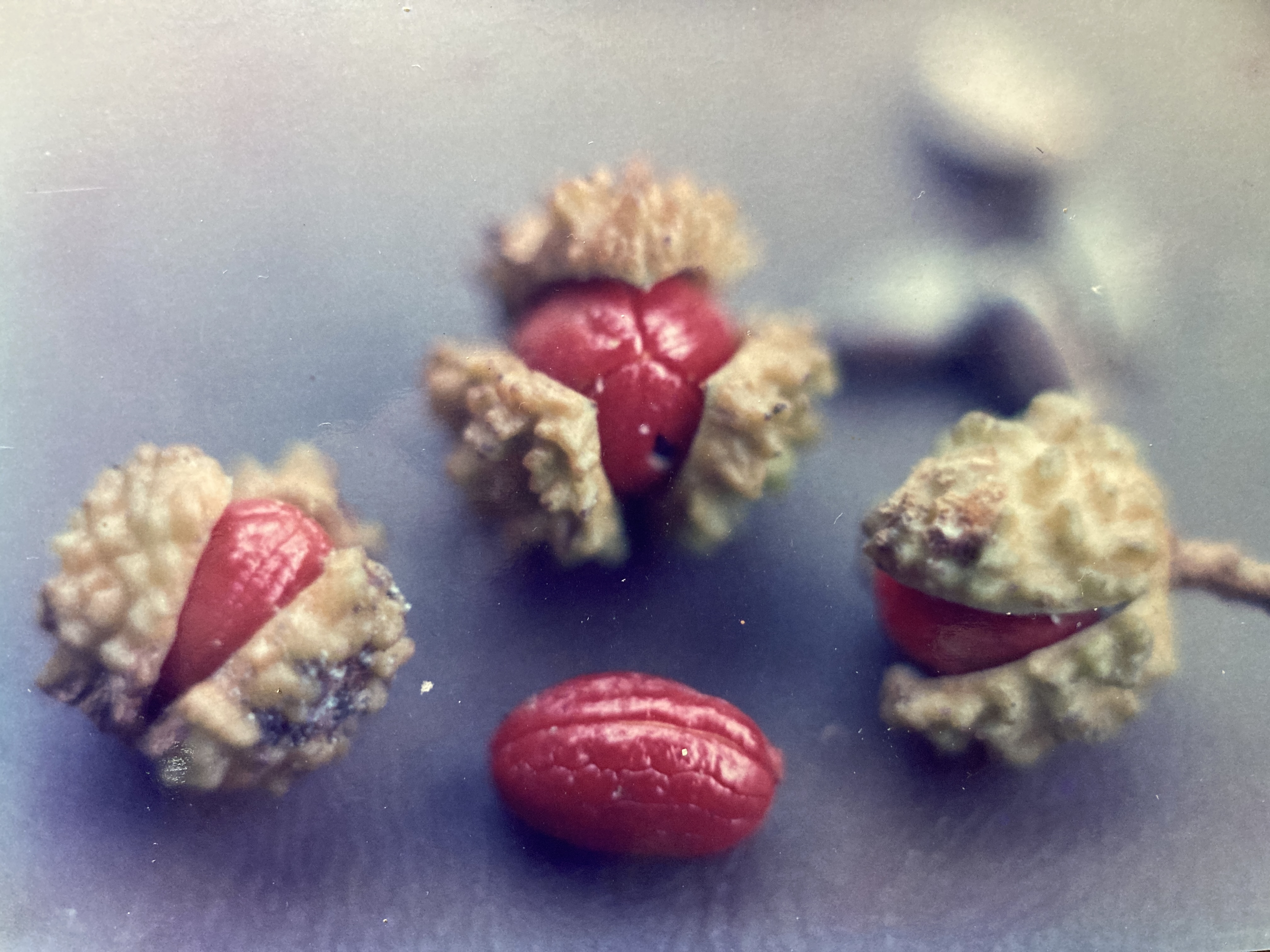 Fruits develop rapidly and grow into green, and later yellow, ovoid capsules (2.5 by 1.5 cm), thickly and characteristically covered by short, stout, waxy tubercules. Clusters of these capsules are positioned in exposed locations near the fringes of the canopy, and they open by splitting into three symmetrical sections. Inside, each contains 3 or 4 seeds, all enclosed in a single, bright red, football-shaped, aril. Long and gray, the seeds share several rounded as well as flattened faces. Harvests begin in July and last through September. Individual trees are again highly variable in the frequency and abundance with which they produce fruits. Large harvests have been observed on some trees during two out of three seasons while others seem to generate small crops on an annual basis. Still others have yet to set any fruit in over five years of observations. Camfin seeds germinate rapidly and easily, usually within a month of falling to the moist forest floor.