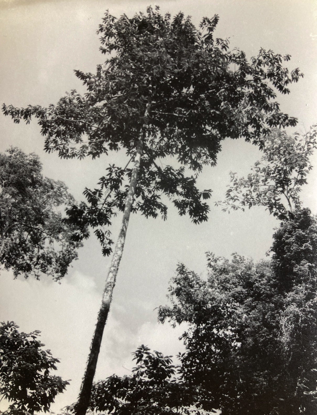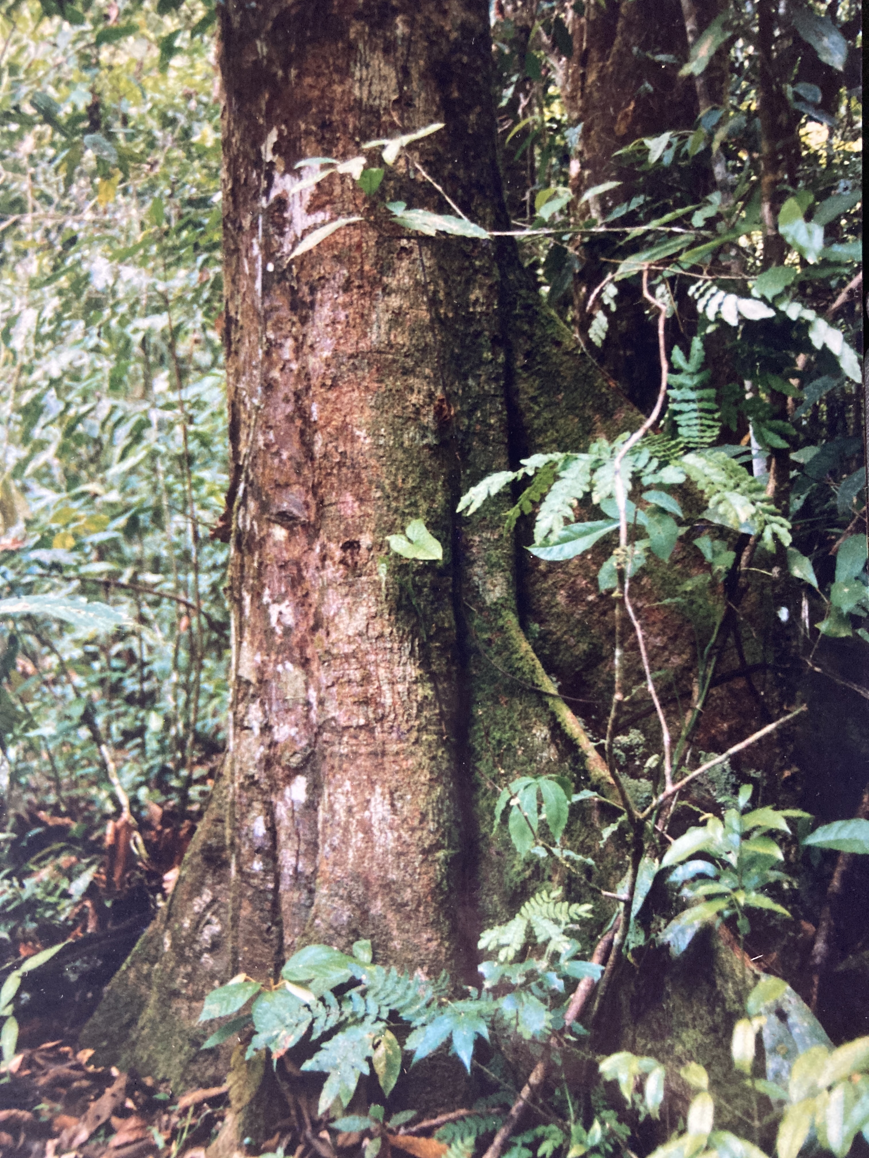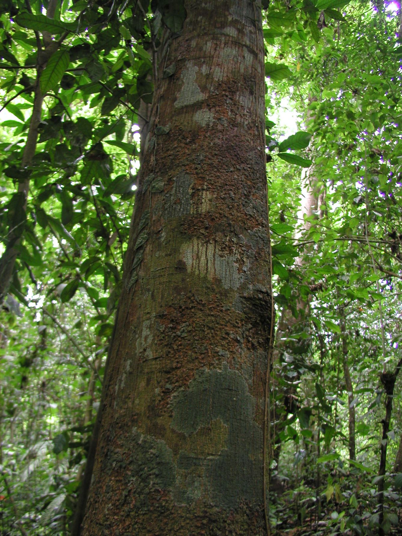 Description: A true pillar of the rainforest, Fruta Dorada has an incredibly straight and perfectly cylindrical trunk ( 85 cm) that rises, without branches, through the lower levels of the jungle and high into the canopy. Clad in smooth, gray or brown bark that is often vertically streaked by fine, parallel cracks, the otherwise regular bole abruptly gives rise to flat and straight buttresses about a meter above the ground. Branches are restricted to the uppermost fifth of the trunk and they emerge perpendicularly to it, extending horizontally outwards. Older (lower) branches are the longest, and limbs decrease in length with position towards the top. The striking, distinctively pyramidal crown thus formed is quite open and thin. According to Allen (1956), Virola has red sap – a characteristic alluded to by the Honduran and Guatemalan common name for this species: “sangre”.