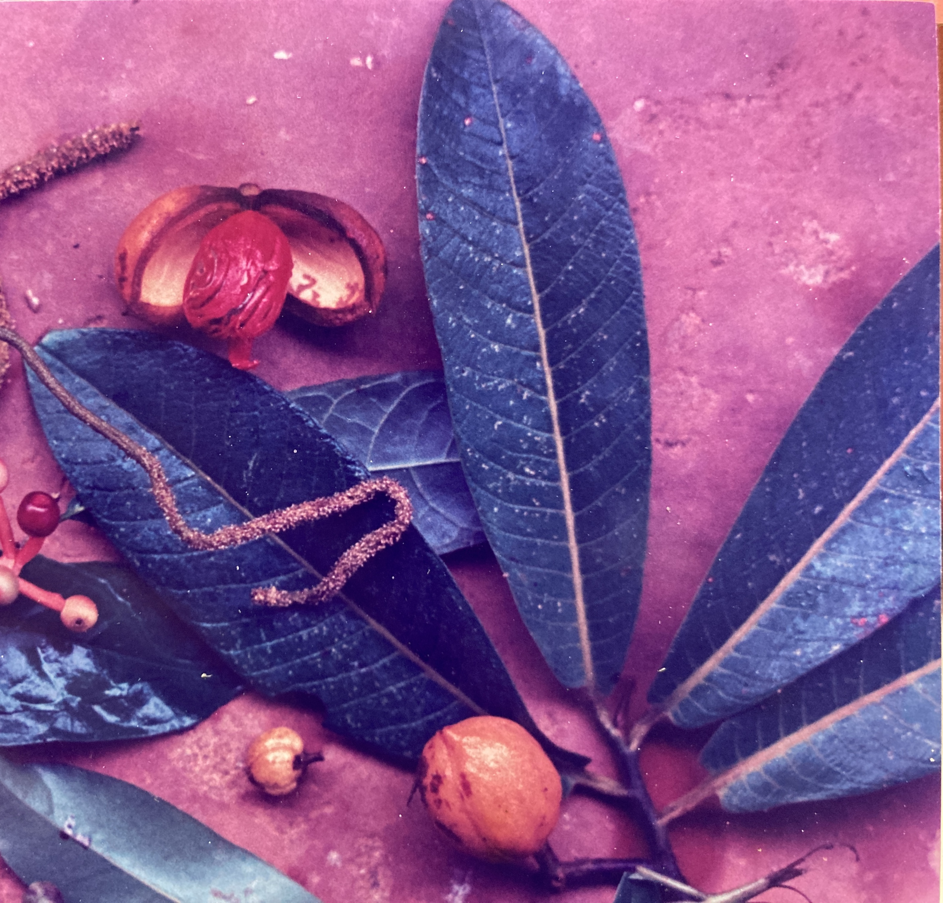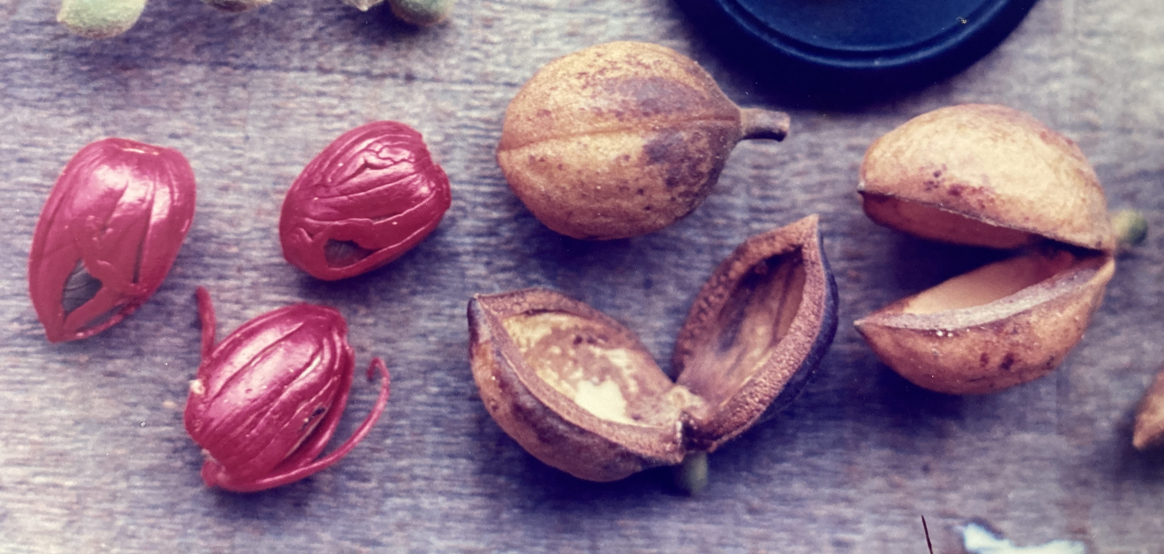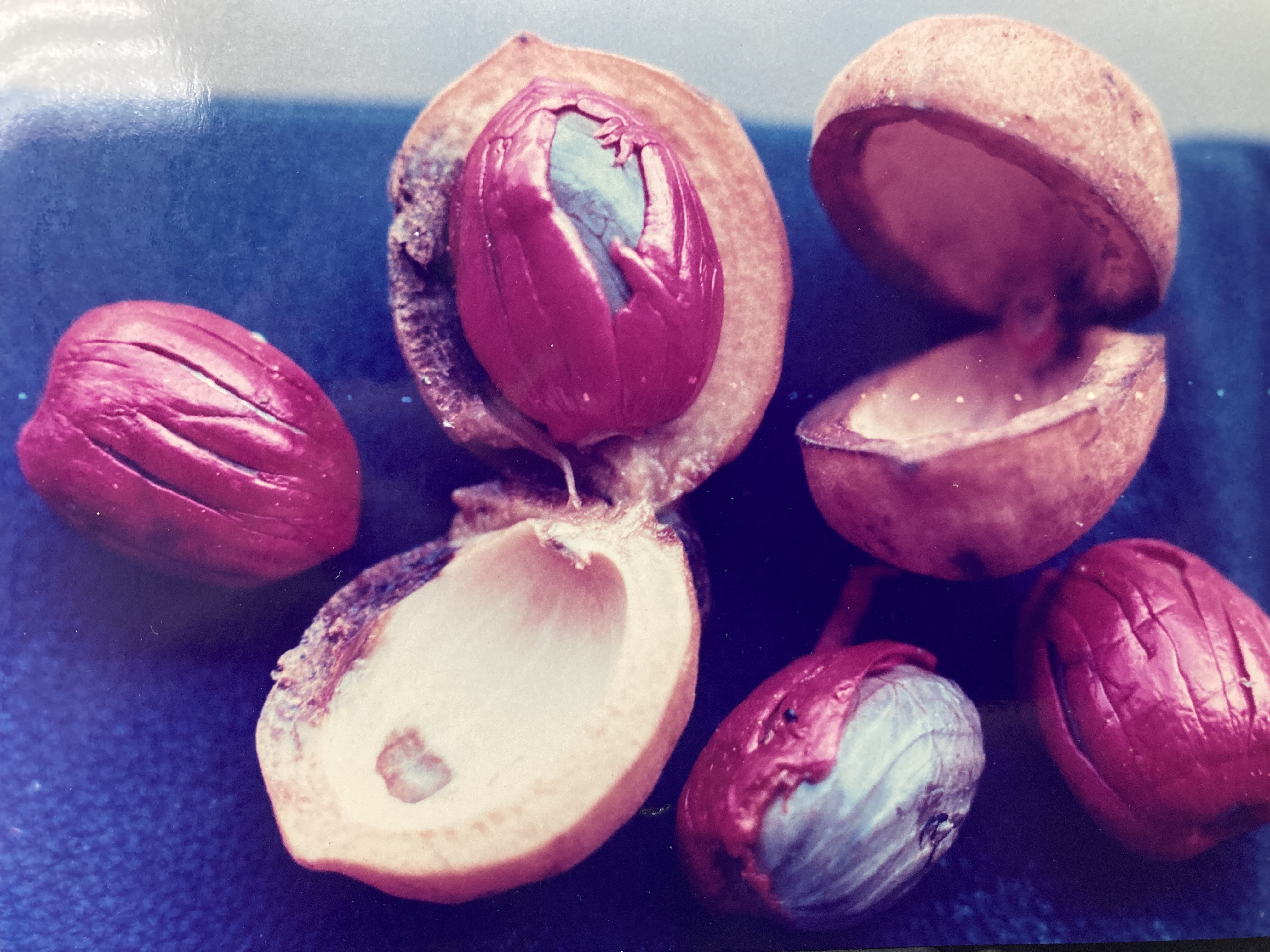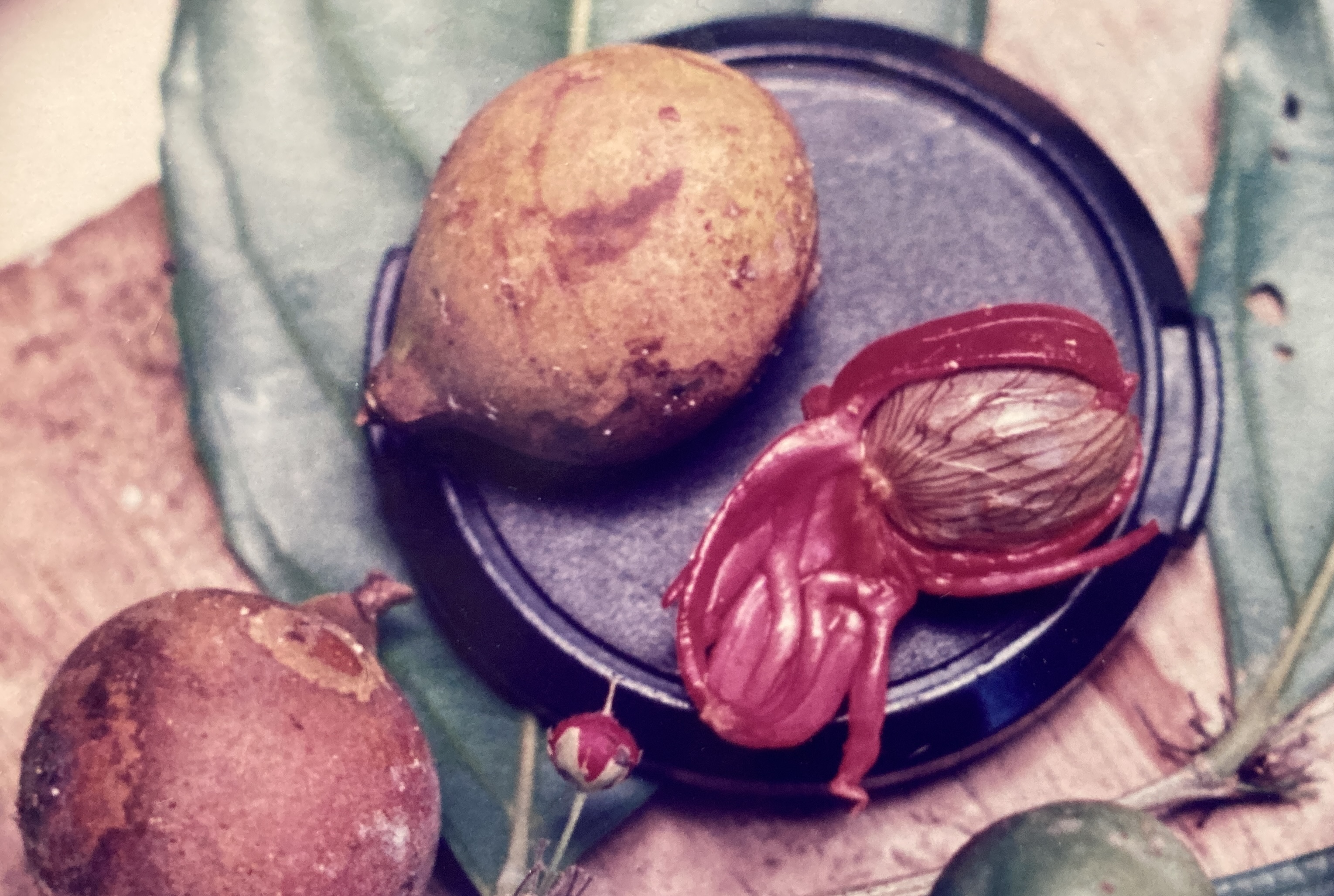 Fruits (3.5 by 3 cm) become visible soon thereafter (on female trees), and mature in about four months. Bright yellow, each consists of a thick, dehiscent, two-part capsule harboring a single, large (2 cm) seed. A distinctive, scarlet red aril, formed from a partially fused mass of finger-like shreds, enshrouds the seed. Brown and ovoid, the ridged seed itself is marked by a network of thin, dark-brown veins that are etched into its surface. Harvests occur from late April to early June. Germination begins within six weeks of fruit fall (often as soon as late June) in the moist soil of the early rainy season. Seedlings, some twenty centimeters tall and bearing two hairy leaves, may then carpet the ground underneath parent trees.