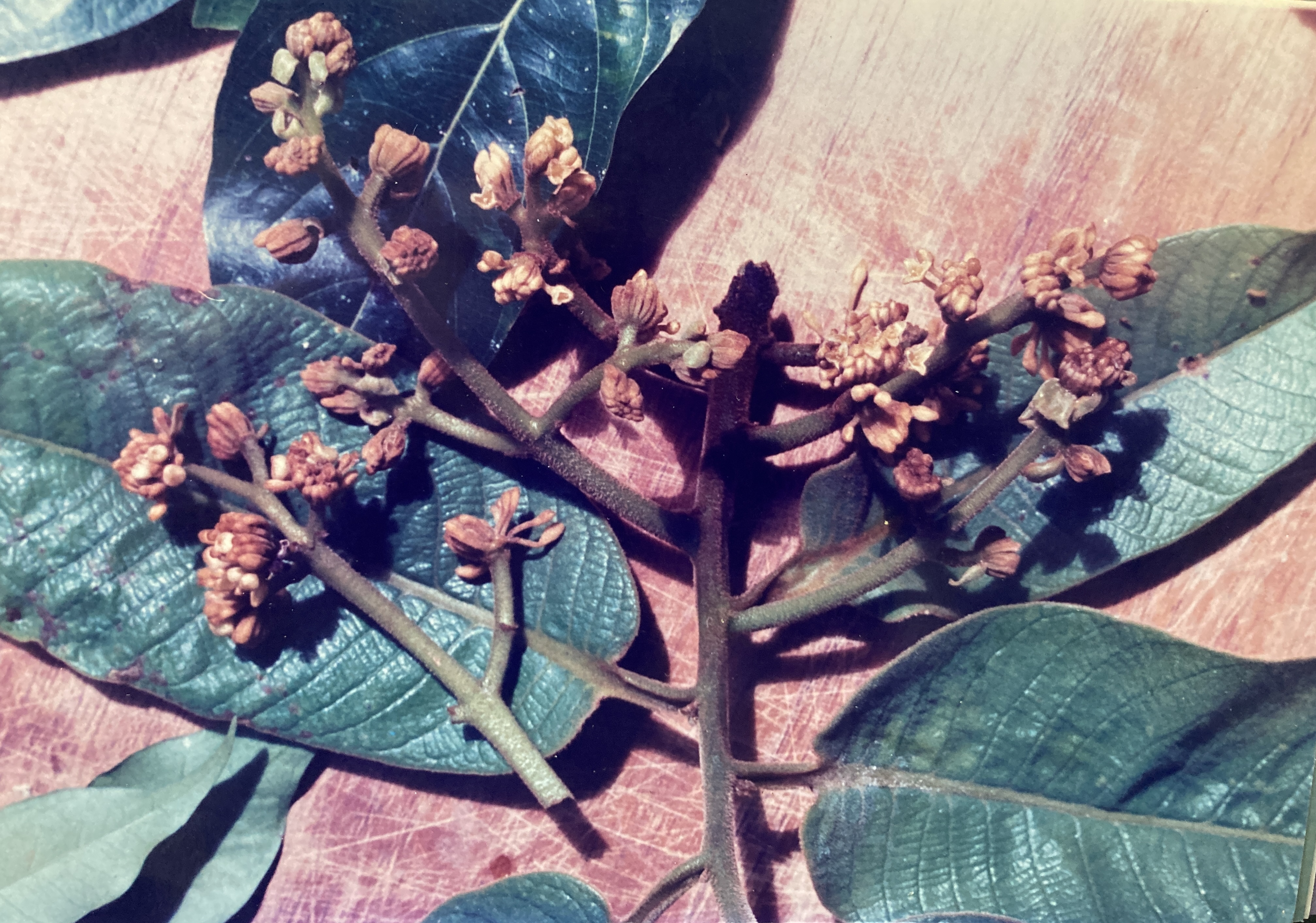 Flowers first appear during this deciduous period, and they are particularly evident among the leafless branches, though they continue to be present even as the leaves grow. Long, mustard-brown flower panicles (10-15 cm), emerging from old (or sometimes current) leaf axils and protected by large, leaf-like coverts, end in flat-topped receptacles that hold thirty or more blossoms each. The small, petalless, somewhat fleshy blossoms (1 by 7 mm in diameter) are essentially composed of three narrow, yellowish sepals. A dioecious species, Fruta Dorada’s two flower types are very similar, with the female variety being slightly browner and the larger of the two. In each, a solitary, central pistil and ovary replaces the male’s anthers. All blossoms have a mild, somewhat spicy aroma that is reminiscent of oregano or nutmeg. Flowering in Virola is not highly synchronized and it occurs over an extended period, lasting from October to February. Individual trees participate for only about one month of this interval.