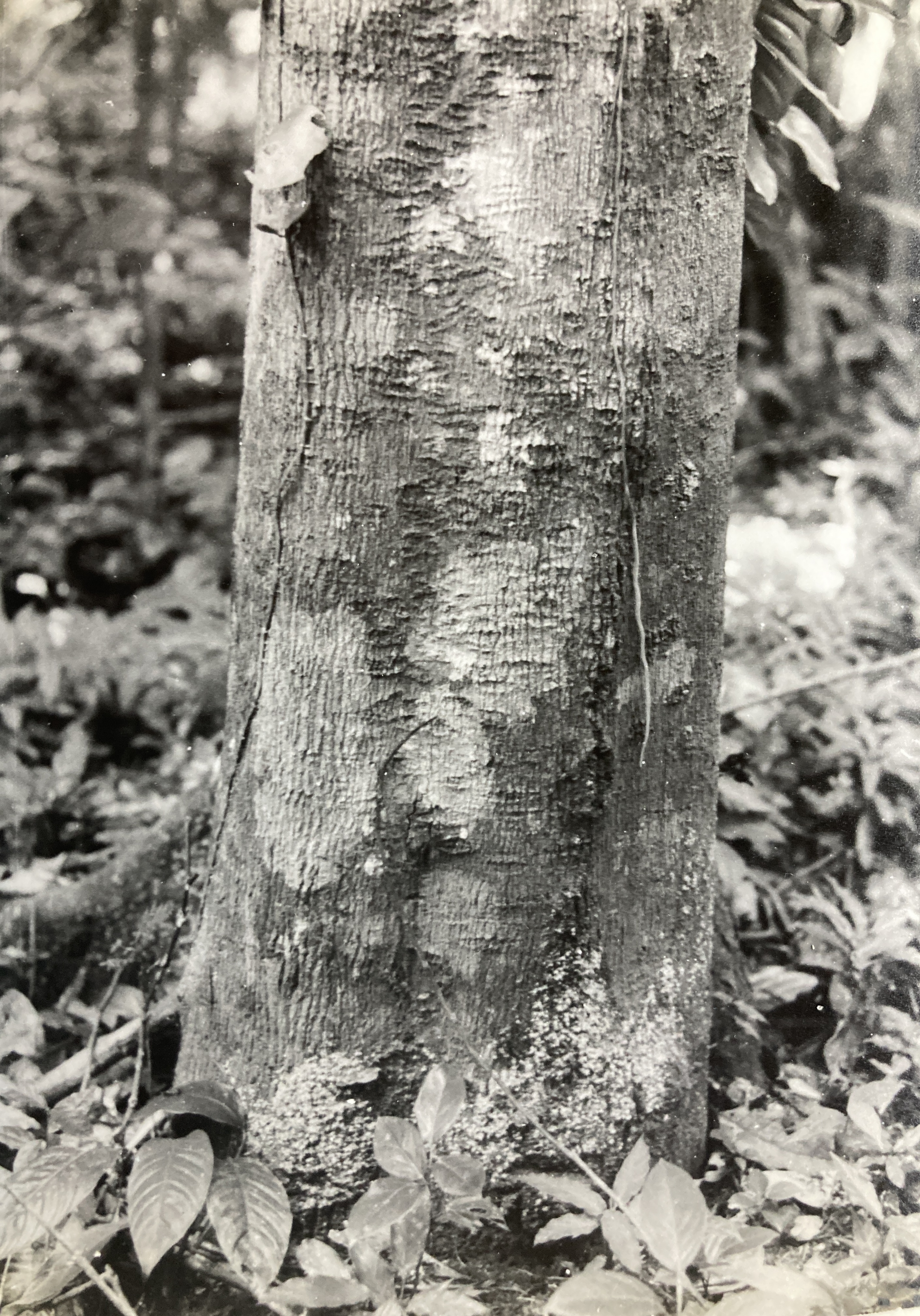 Description: Dwarfed by its close relative (Virola koschnyi), this species has a straight, cylindrical trunk that rarely exceeds 20 cm in diameter. Young trees possess smooth, dark colored bark that is streaked with fine, vertical lenticels. Becoming lighter and rougher with age, Virola bark demonstrates a moderate degree of exfoliation in larger individuals. Elevated scars appear at periodic intervals along the unbranched portion of the monopodial bole, marking the positions of old limbs. Buttresses are absent. Very long, thin, horizontal branches emerge at right angles to the trunk, along the upper third of its length. With increasing distance from the bole, these highly flexible – even whip-like – branches droop under the weight of the foliage they support. These limbs create a narrow, relatively tall, thin crown with the pyramidal form typical of the genus. Leaves (2 by 6 cm) are simple and alternately arranged. Long and narrow, Virola blades retain the same width for most of their length, abruptly narrowing to drip tips only at their extreme distal ends. Rust-colored hairs cover the under surfaces of the leaves and are especially thick on the petioles (1 cm) as well as along the thin, zig-zagging twigs. Fruta Dorada undergoes a long period of active growth and leaf production beginning in August and lasting through December, when flower buds first appear. Flowers are generated in dense, rust-colored, axillar panicles. Restricted to positions located roughly two-thirds along the length of the branches, these tawny colored inflorescences can be difficult to see amid the foliage.