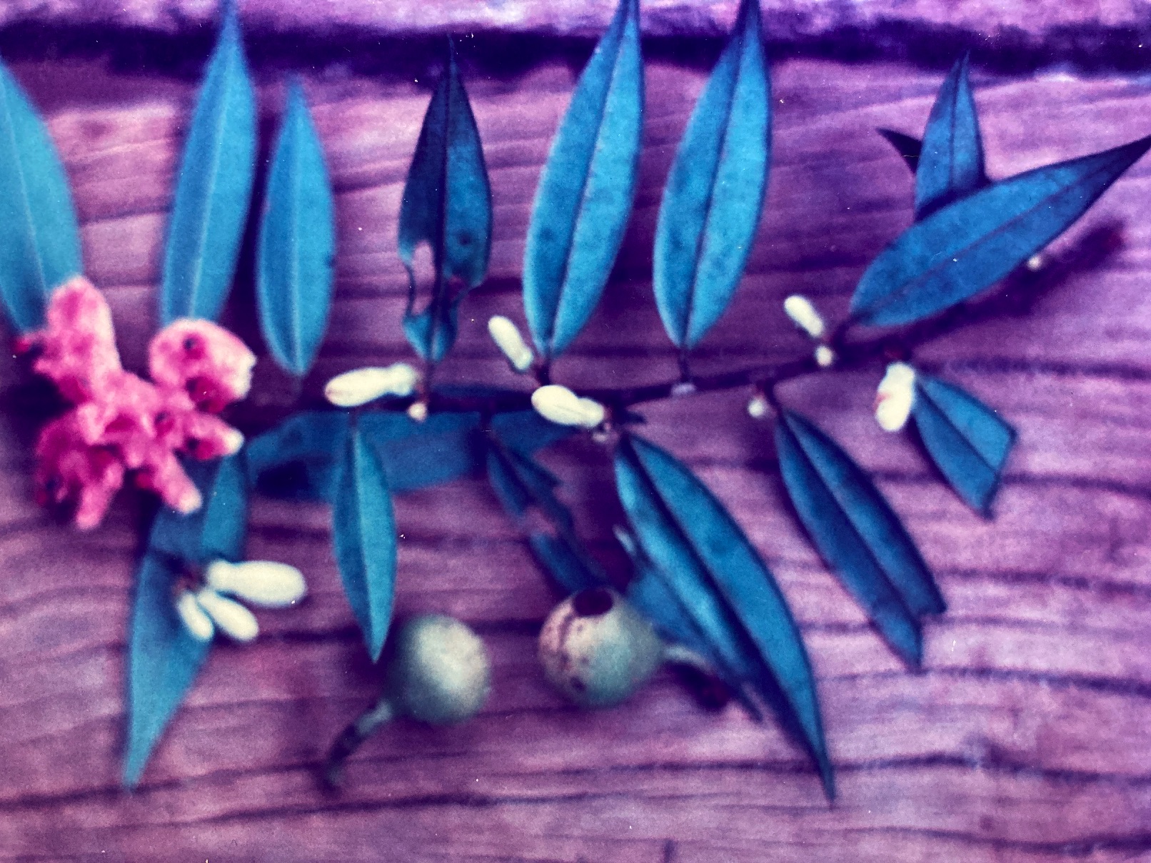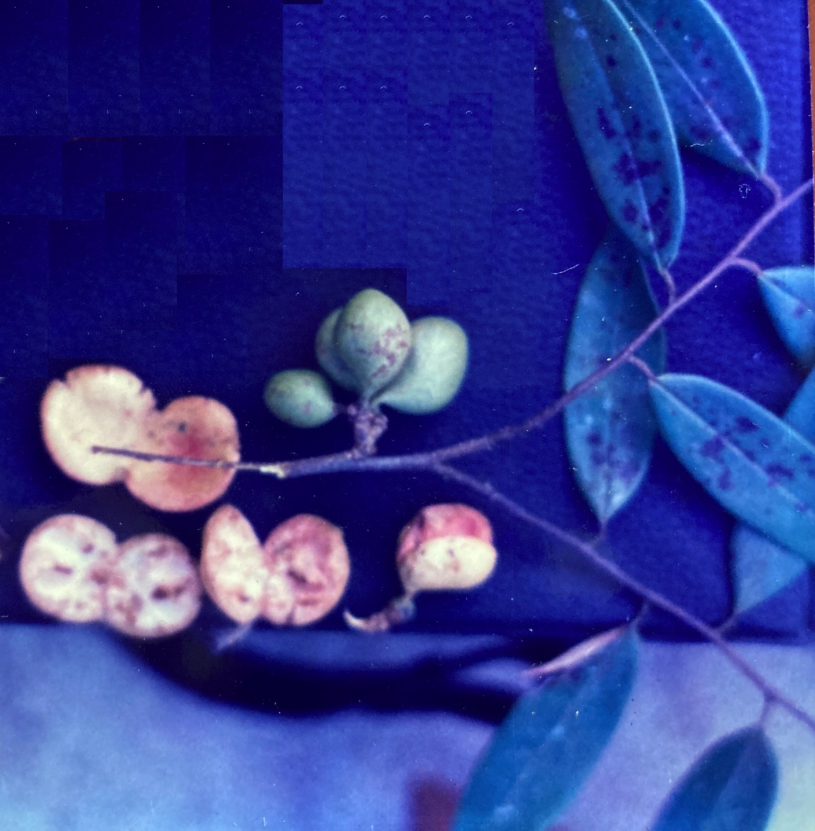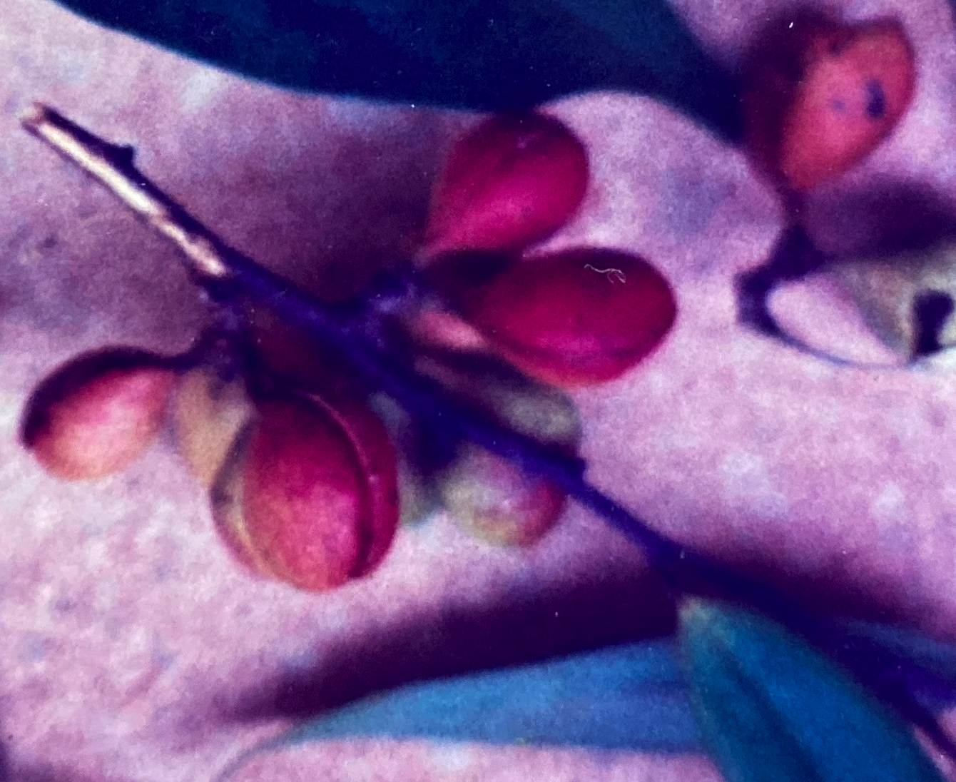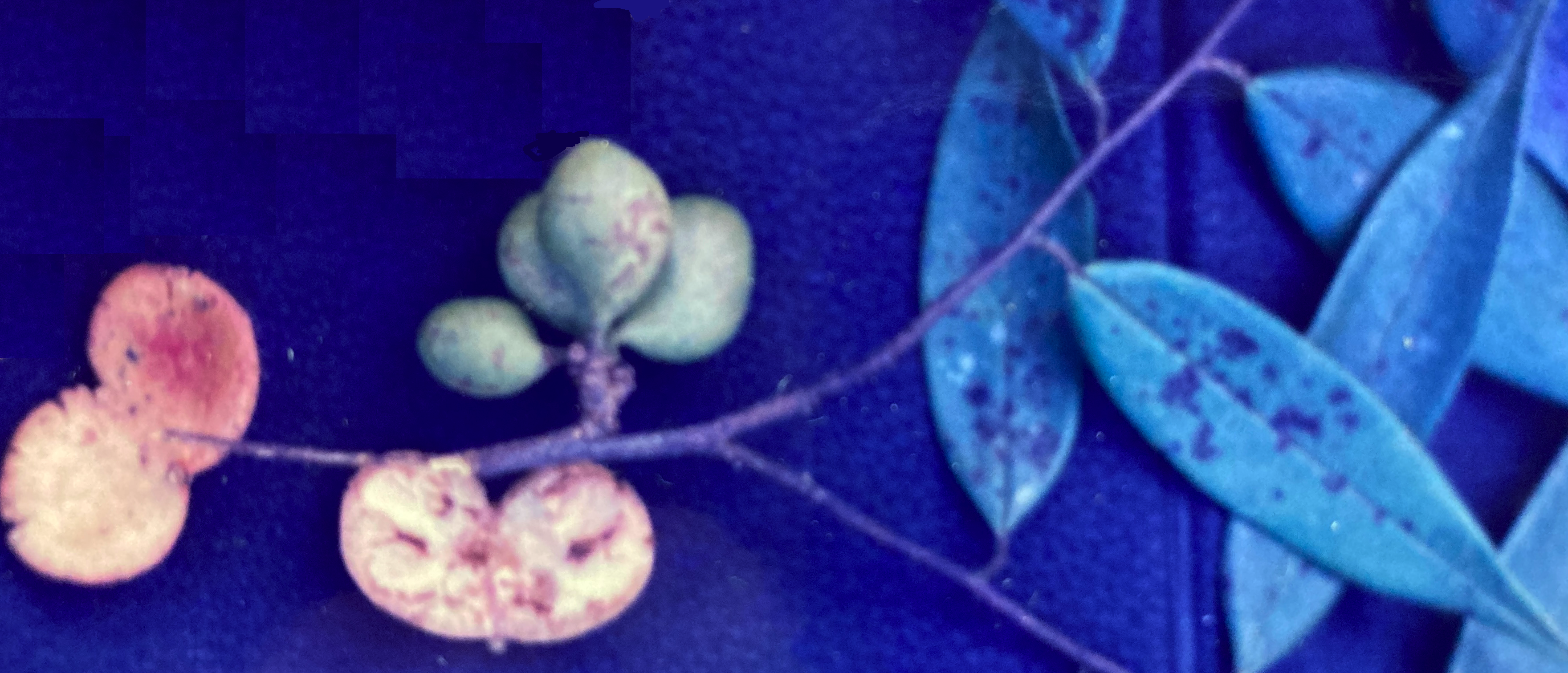 Almost immediately thereafter, small green knobs become visible along the branches and amid the foliage. These immature fruits remain more or less dormant until October, when they finally begin to enlarge rapidly. Still, they do not ripen until eight months after flowering ends. Mature fruits (1 cm) are capsules borne in small clusters located largely on the bare portions of the twigs behind the flush of new leaves. (Though the flowers were formed in current leaf axils, the continued growth of the twig during the protracted interval before fruit development left these latter structures behind on the branches.) In form, each capsule resembles the fattened head of a golf club. Turning from green to yellow, ripe fruits split longitudinally and reveal a nearly-fluorescent pink interiors with two, small (6 mm by 3 mm) rod-like, black seeds embedded in each. Harvests last from late January or early February though March, and they are consistent in annual timing and size.