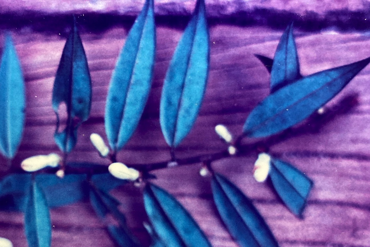Xylopia‘s creme-colored flowers appear in small panicles from leaf axils. Each blossom consists mainly of three, thick, spongy petals covered with a fine, velvety pubescence and fused at the base. Set in a small green calyx of three triangular sepals, the corolla maintains a roughly cylindrical shape (actually resembling a minute bowling pin) since the long (1 cm) but narrow petals are closed most of the time – hiding the stamens and pistil within. Flowering periods are annual, precisely timed, and well synchronized events that last from May though June.