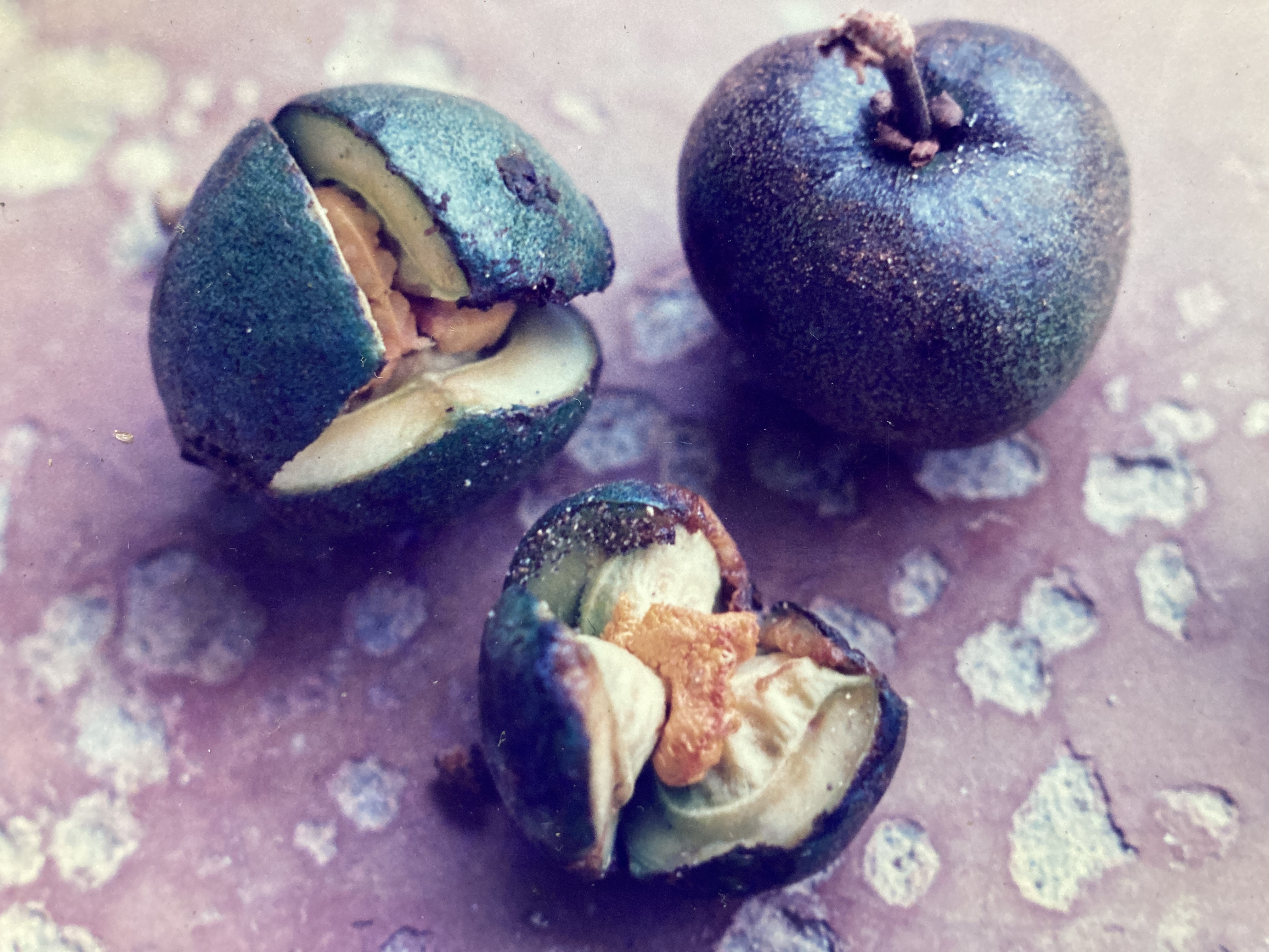 Description: Zuelania’s buttressless trunk (55 cm) is perfectly cylindrical, very straight, and slowly tapering, with branches restricted to the very top of the tree. There, relatively few, but quite long and flexible, limbs are borne at right angles to the main tree trunk and form a thin, pyramidal crown. The bark is finely textured, light silvery-gray in color, and it is densely covered by elevated, wart-like lenticels. Zuelania leaves (10-15 cm by 3.5 cm) are simple, alternate and have slightly crenulate margins. The thick, leathery, and elliptical to slightly oblanceolate blades are smooth, however veins and petioles (1 cm) are covered by a rust-colored pubescence. Foliage is completely shed in January and early February and, after a short leafless period, begin to re-grow in April from the terminal or subterminal ends of the branches. Trees continue this growth at a slow pace throughout the rainy season. Plomillo flowers (1 cm) appear from late February through April in spherical, head-like clusters at the ends of the leafless branches. Supported at the ends of long pedestals (2 cm), they are green with 5 sepals, no petals, and a ring of numerous short stamens surrounding a central, globular pistil and ovary. The fruit is a large (to 15 cm) globular, dark green berry. Fleshy, soft, and resinous (even zucchini-like), the outer layer of the fruit is responsible for most of its great mass. Upon ripening, this outer husk splits distally into three sections, exposing hundreds of small white seeds cloaked in bright-orange arils. Eventually, these dense bodies come crashing – sloppily – to the ground. Harvests last from April through June, with large crops produced by all individuals on an annual basis.